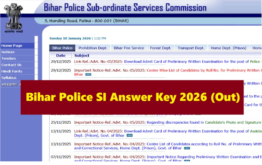 The Bihar Police SI Answer Key 2026 has been released for the Preliminary Examination conducted on 18th and 21st January 2026. Candidates who appeared for the Sub-Inspector (SI) recruitment exam can now download the Prelims Answer Key and Response Sheet PDF from the official website of Bihar Police Subordinate Selection Commission (BPSSC) at bpssc.bihar.gov.in.