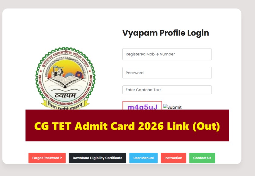 Sarkari Result CG TET Admit Card 2026 Download Link- The CG TET Admit Card 2026 has been officially released by the Chhattisgarh Professional Examination Board (CGPEB) on 19 January 2026 at https://vyapamprofile.cgstate.gov.in/online. Candidates who have applied for the Chhattisgarh Teacher Eligibility Test (CG TET) 2025 can now download their hall ticket from the official website … Read more