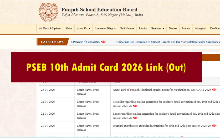 The Punjab School Education Board (PSEB) has released the PSEB 10th Admit Card 2026 for the upcoming matric examinations. Students appearing in the Punjab Board Class 10 exams can now check the availability of their hall ticket and prepare accordingly. The admit card is a mandatory document for entering the examination hall, so candidates are … Read more