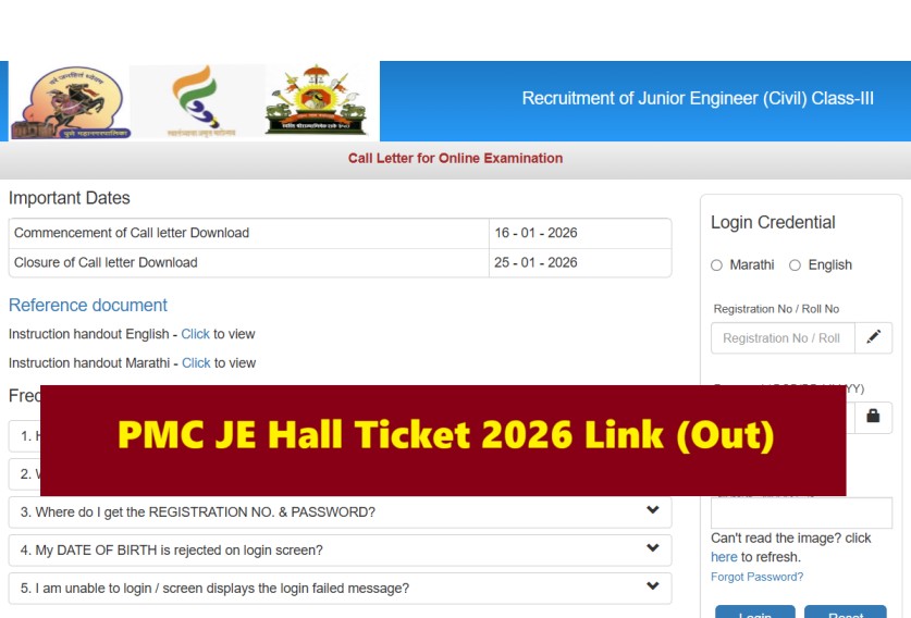 The PMC JE Hall Ticket 2026 has been officially released by the Pune Municipal Corporation (PMC) on 19 January 2026. Candidates who are going to appear for the Junior Engineer (Civil) re-examination under Advertisement No. 1/1579 can now download their admit card from the official website pmc.gov.in.
